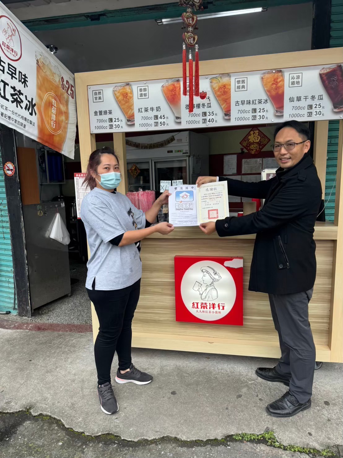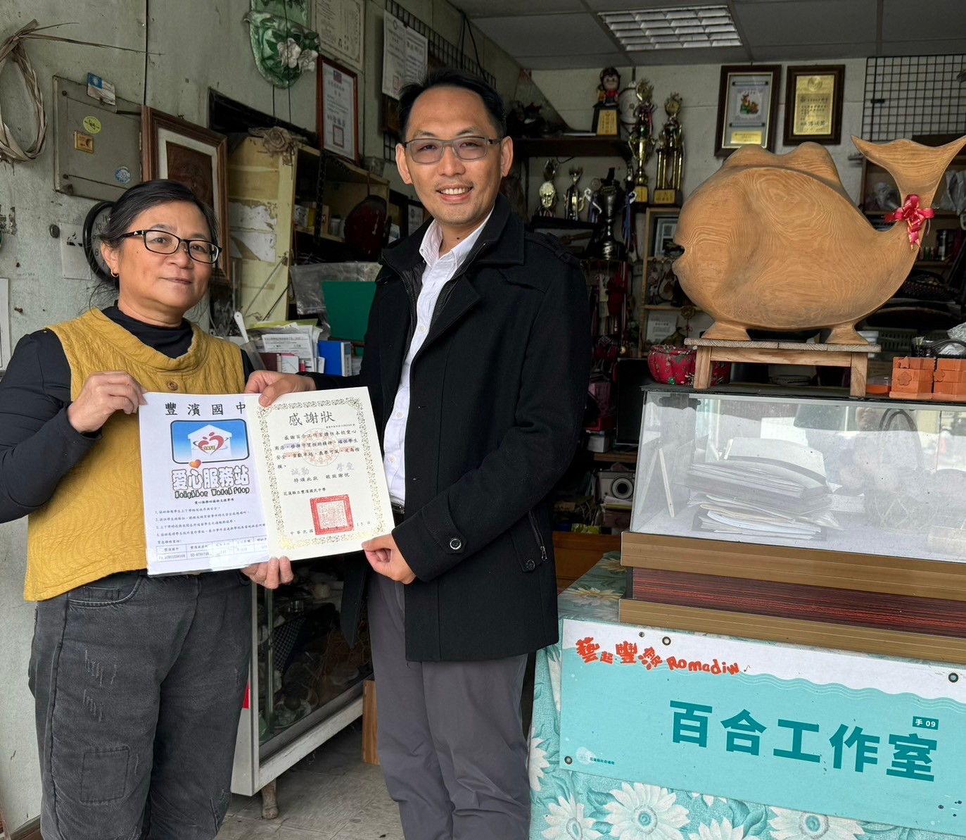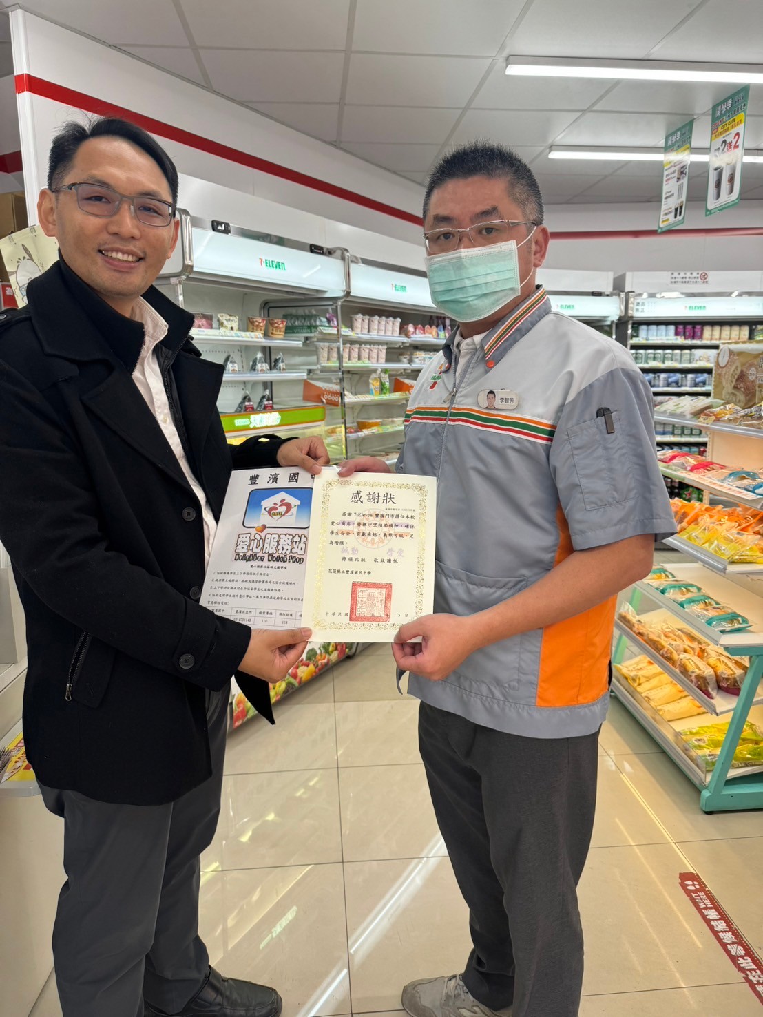 ????為營造安全的步行通學環境,本校結合警政、社區力量設立「愛心商店」,截至112學年度上學期已有11家加入,並於下學期陸續與商店協調以增加愛心商店數量,透過學區鄰近商家的共同幫助,串聯起豐濱國中學子們步行上下學安全、友善回家的路,為感謝愛心商店保障學子安全,本校也特別製作感謝狀,由施校長沿學生通學必經之路,逐間拜訪致贈。
