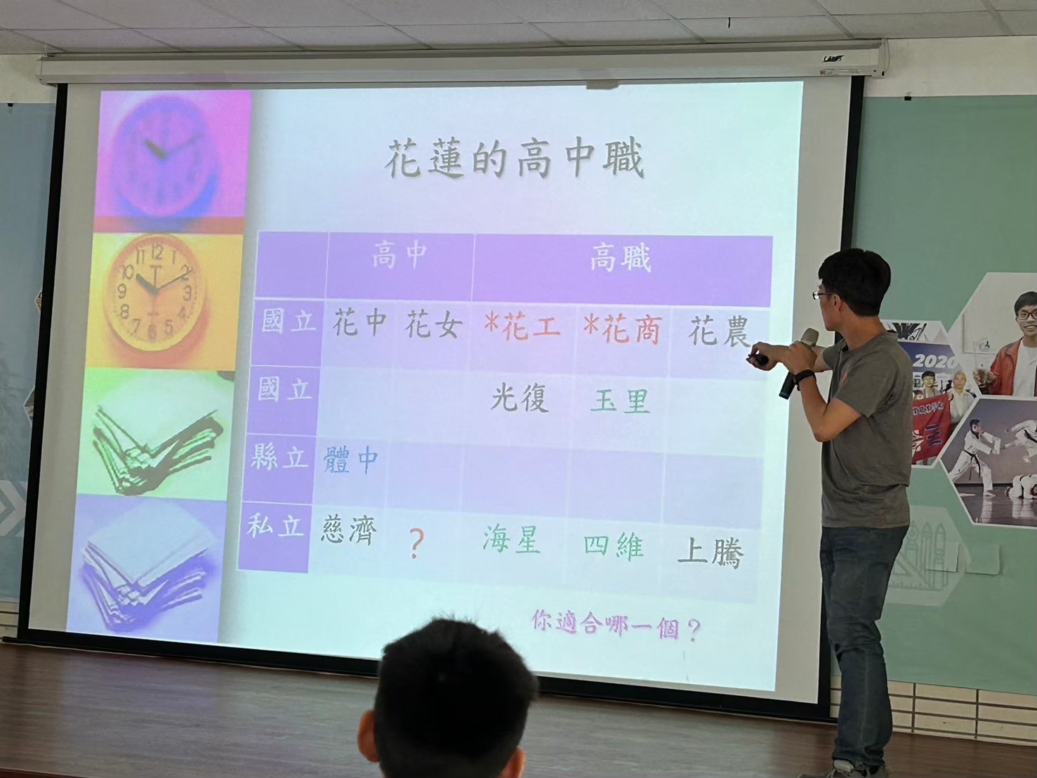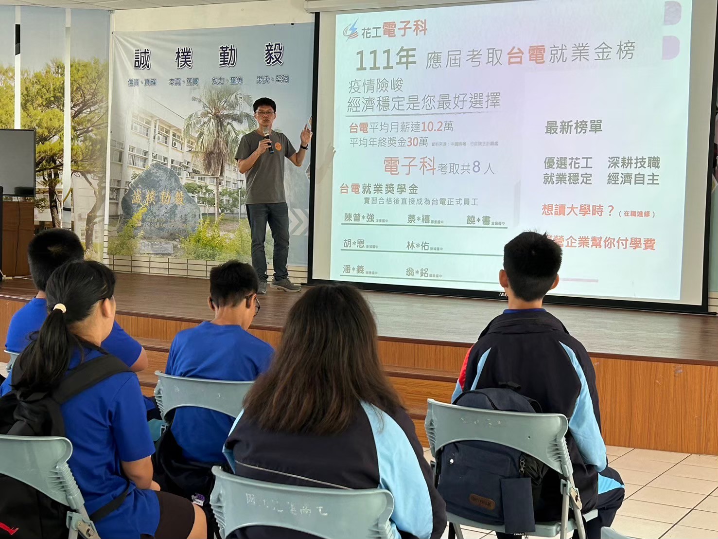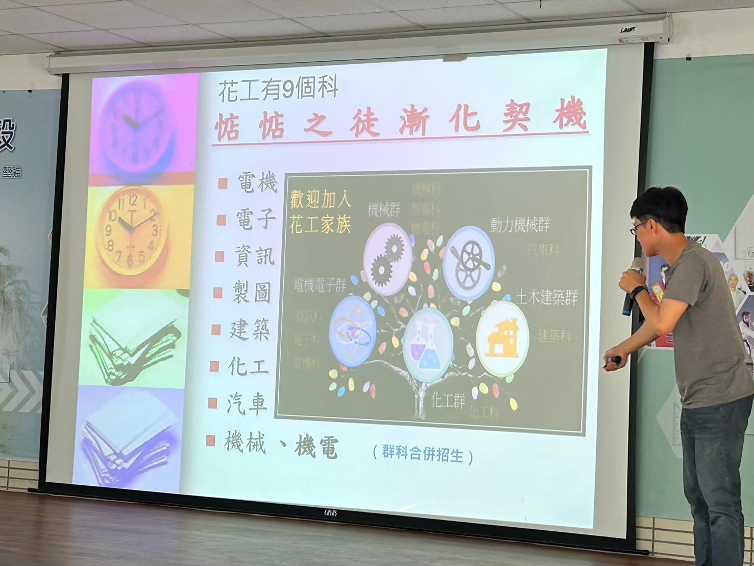 本學期高中職生涯參訪,我們來到花蓮高工與花蓮高農,在張世穎老師的介紹下,我們看見了花工的產學合作為花工的學子開拓了台電與台積電的高職畢業即就業的機會,只要願意努力願意學,每天進步1%,一年之後也能成長37.38,只要肯做肯學,總是有機會可以出人頭地;此外,我們參訪了製圖科與汽修科,學生從設計開始製圖到最後指尖陀螺產出,親身體驗從想法設計到成品產出的過程;汽修科了解到只要肯動手肯操作,不怕吃苦,汽車、機車都能掌握手中。