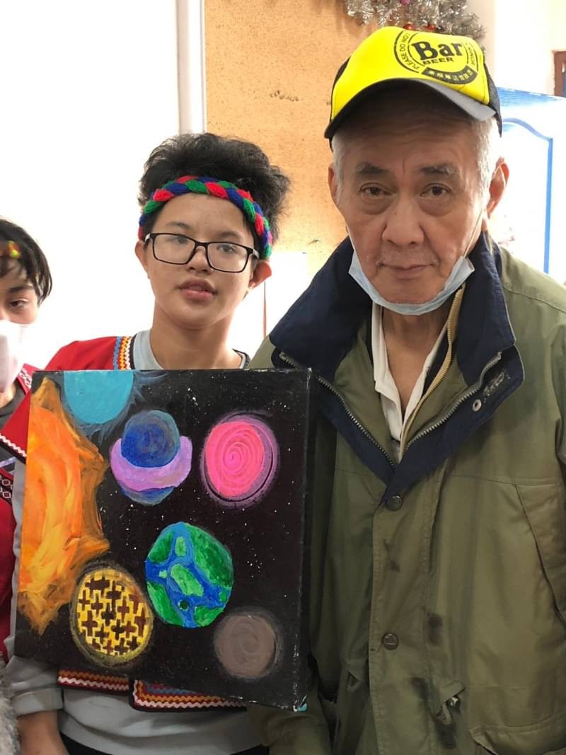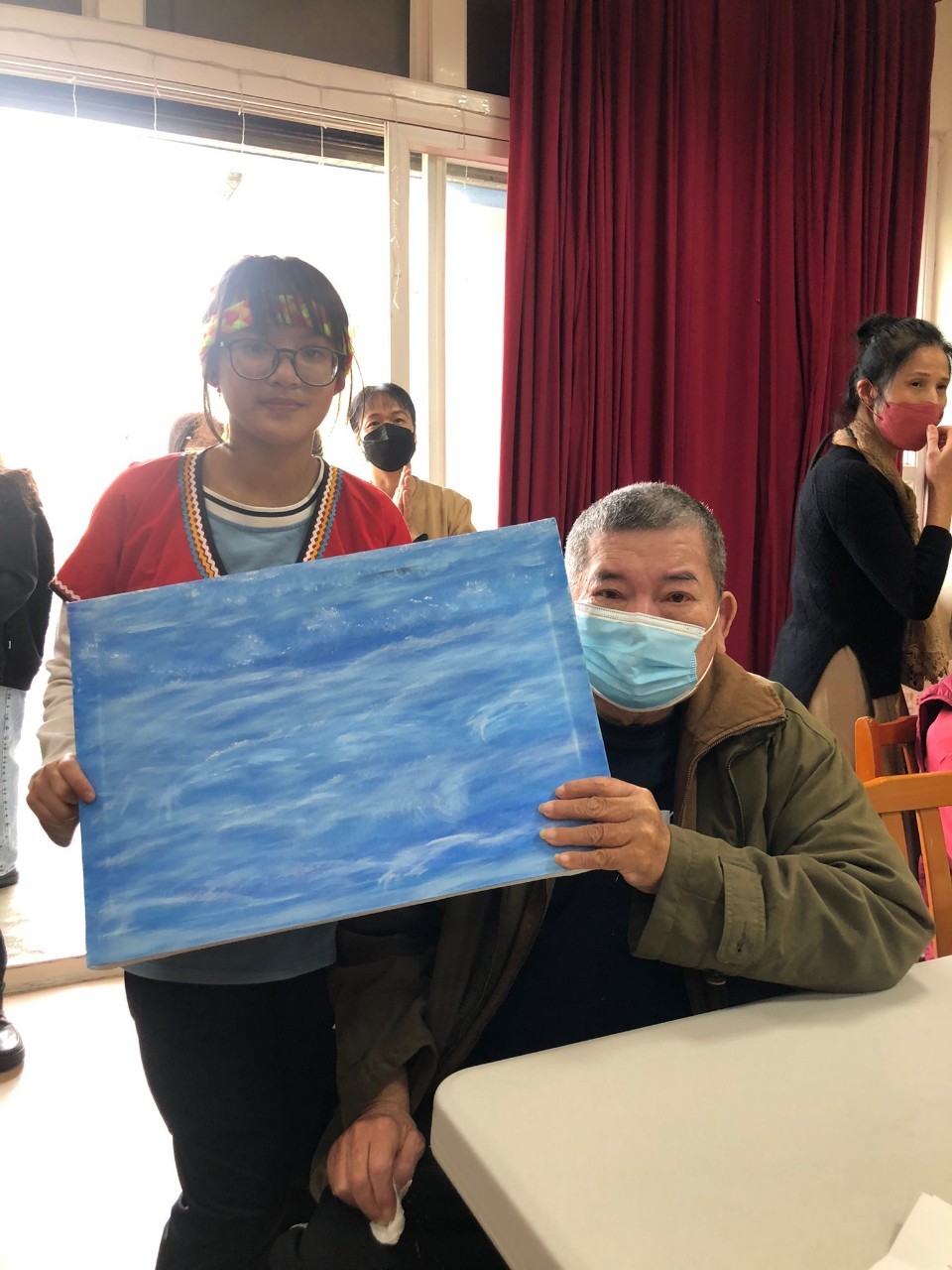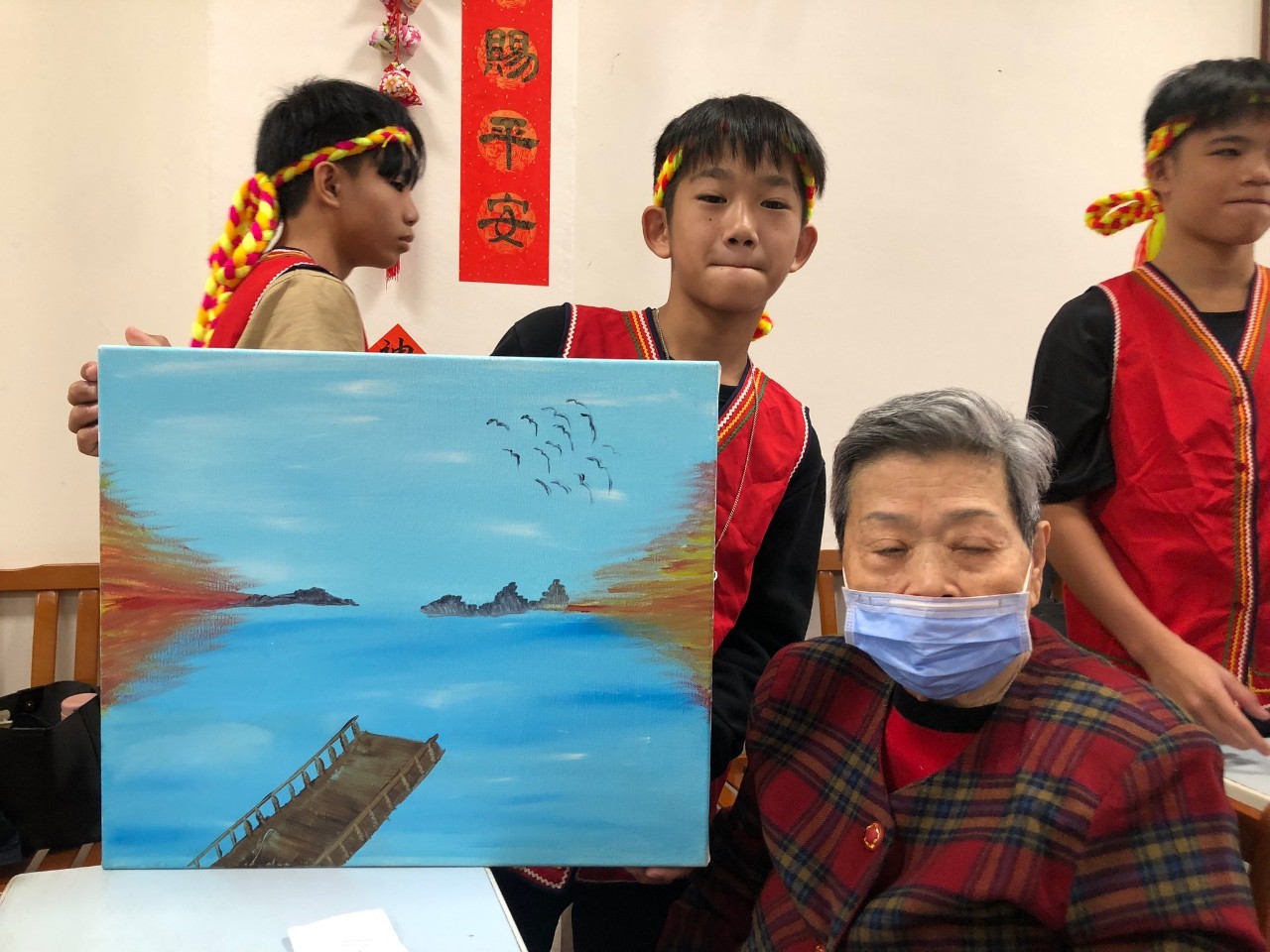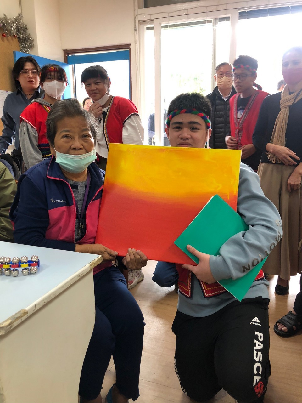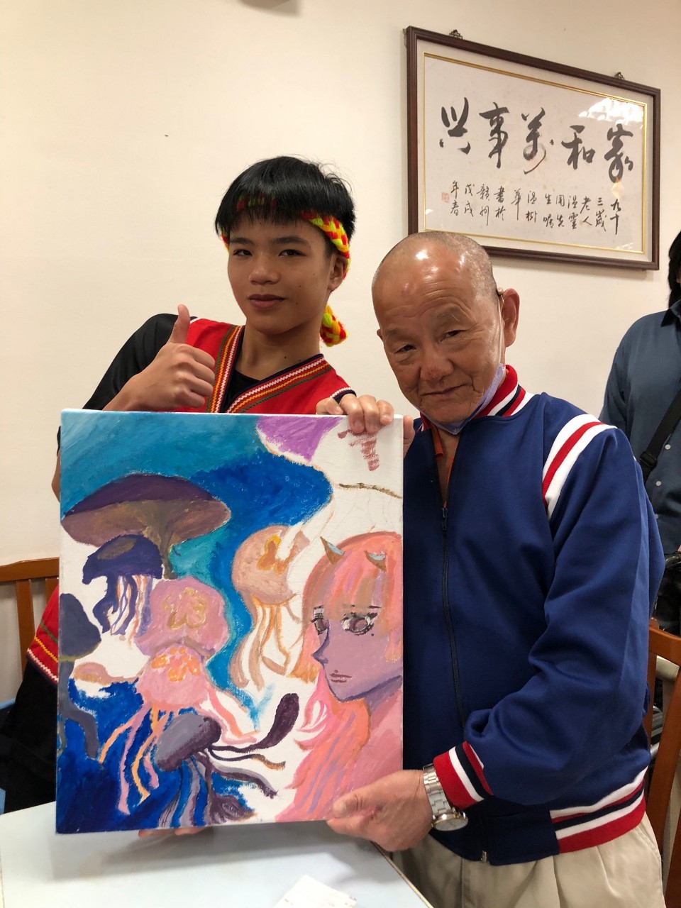 豐濱國中校長施宜廷一早八點就來到花蓮榮譽國民之家現場,一起見證學生們經歷「施比受更有福」之獻唱、祝禱、送畫的美麗畫面,也語帶驕傲的口吻分享著豐中小學堂學生屢次在畫作上的得獎事蹟,同時肯定與嘉許學生願意用贈畫行動來傳愛送暖給長者。