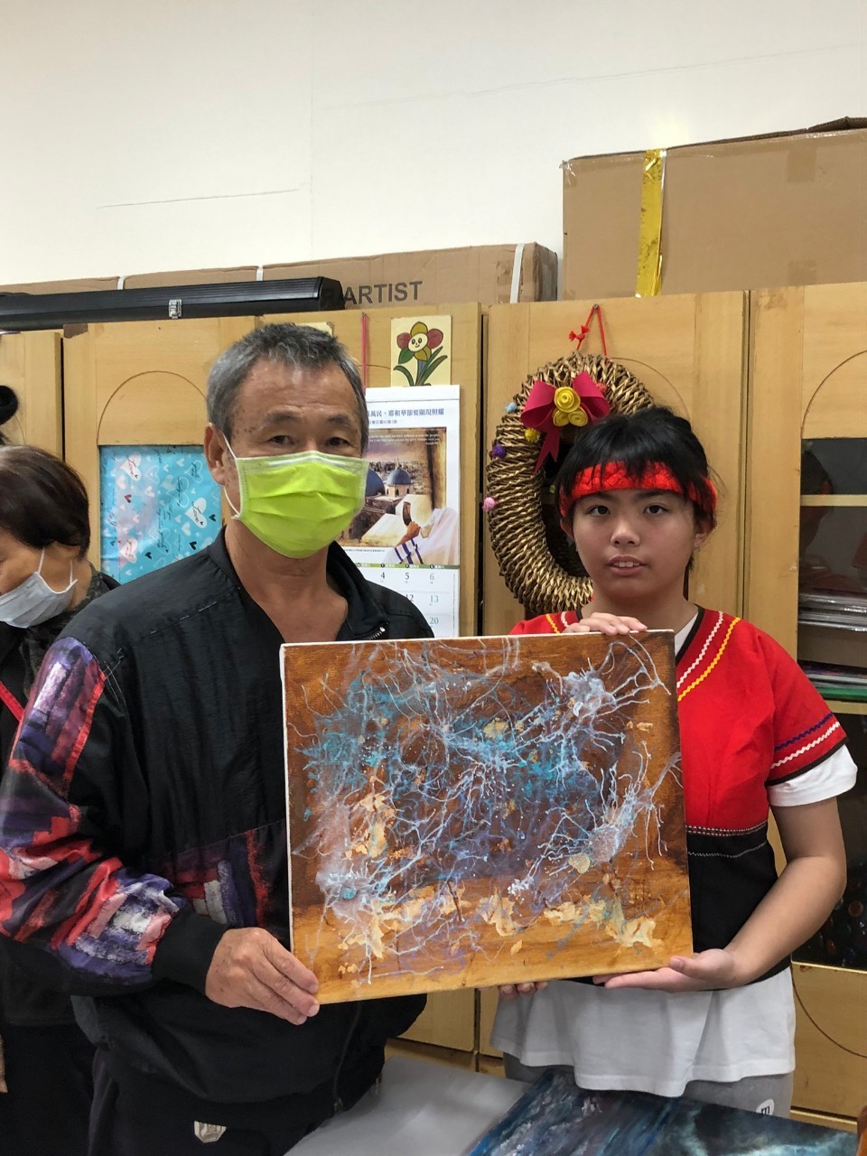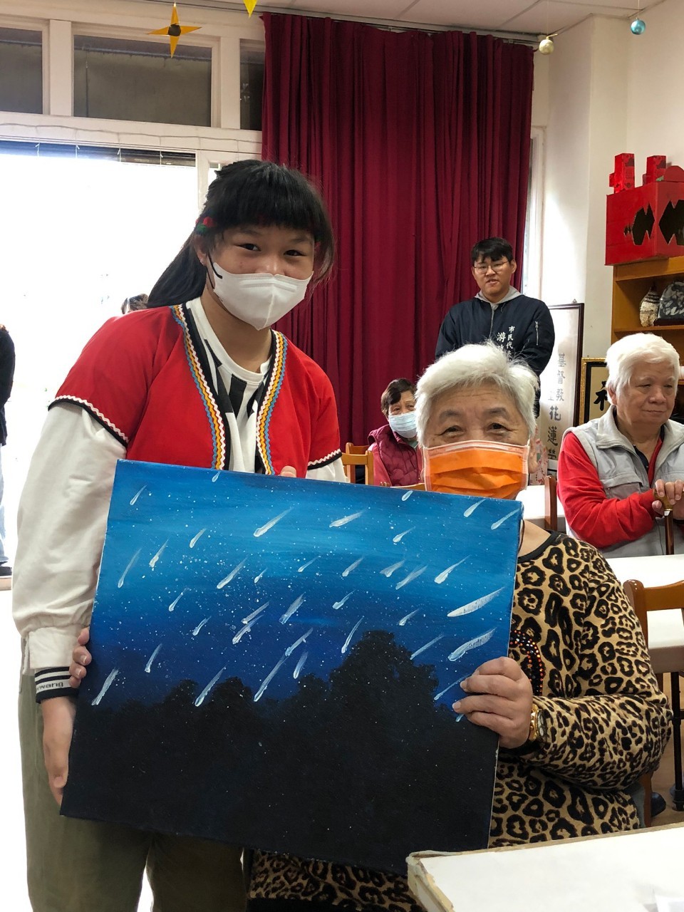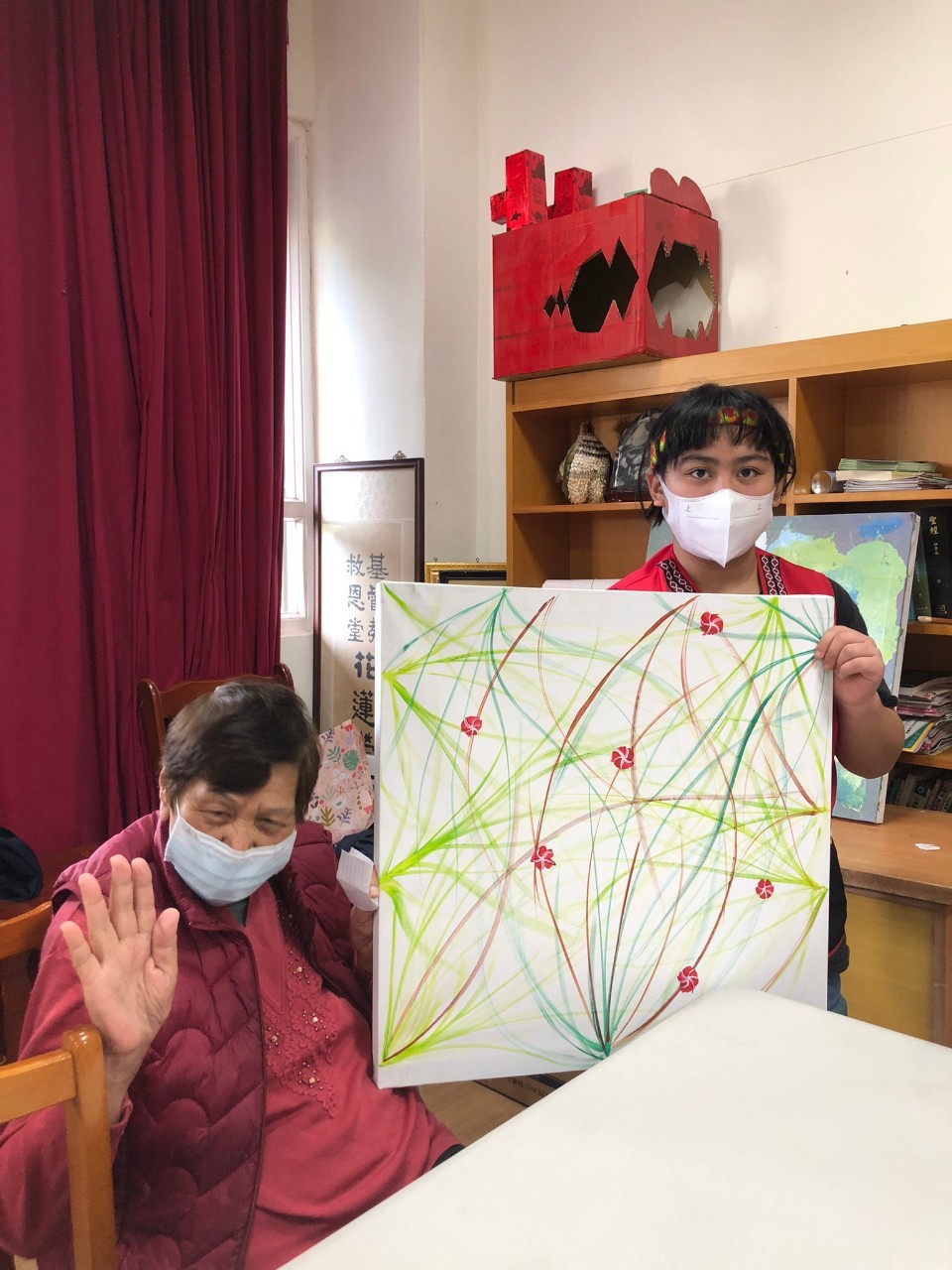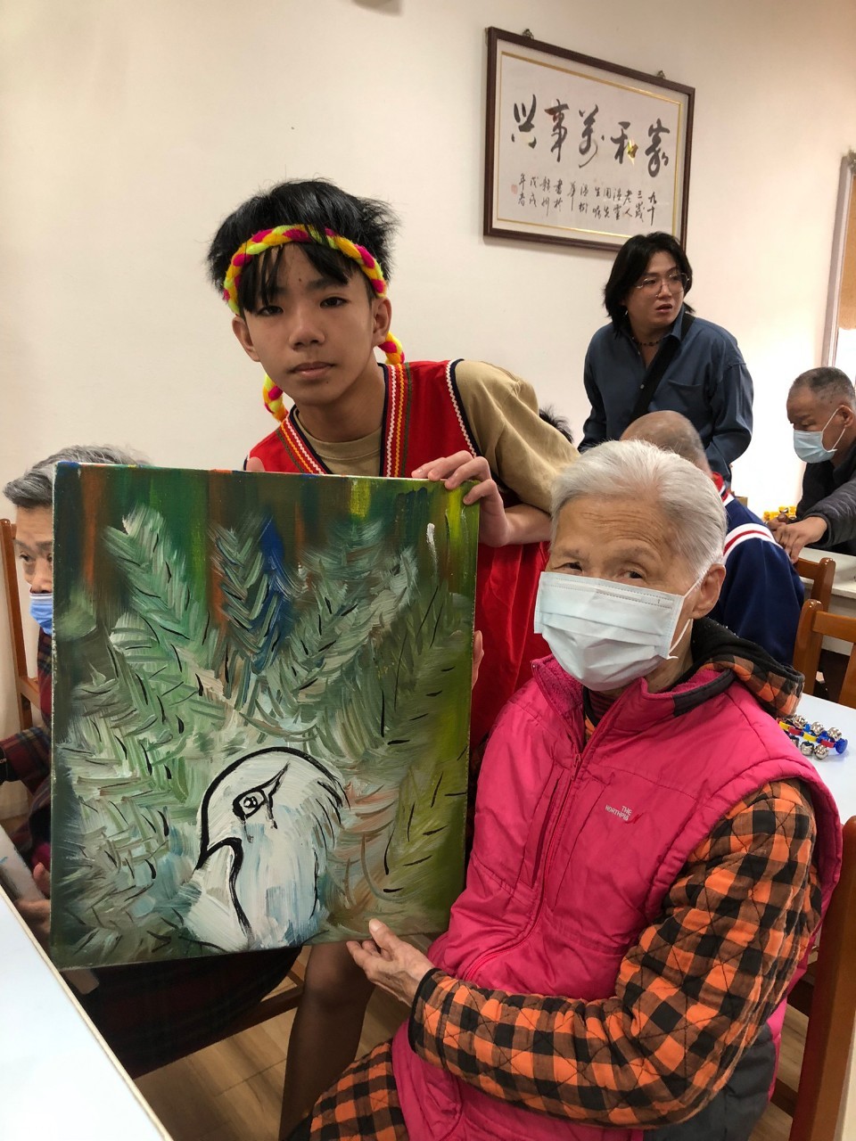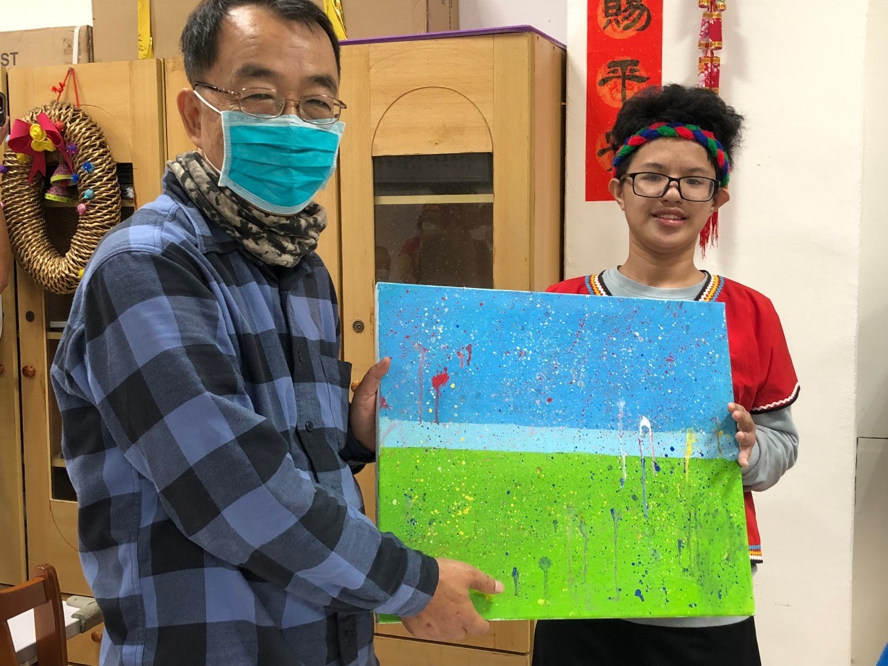 豐濱國中校長施宜廷一早八點就來到花蓮榮譽國民之家現場,一起見證學生們經歷「施比受更有福」之獻唱、祝禱、送畫的美麗畫面,也語帶驕傲的口吻分享著豐中小學堂學生屢次在畫作上的得獎事蹟,同時肯定與嘉許學生願意用贈畫行動來傳愛送暖給長者。