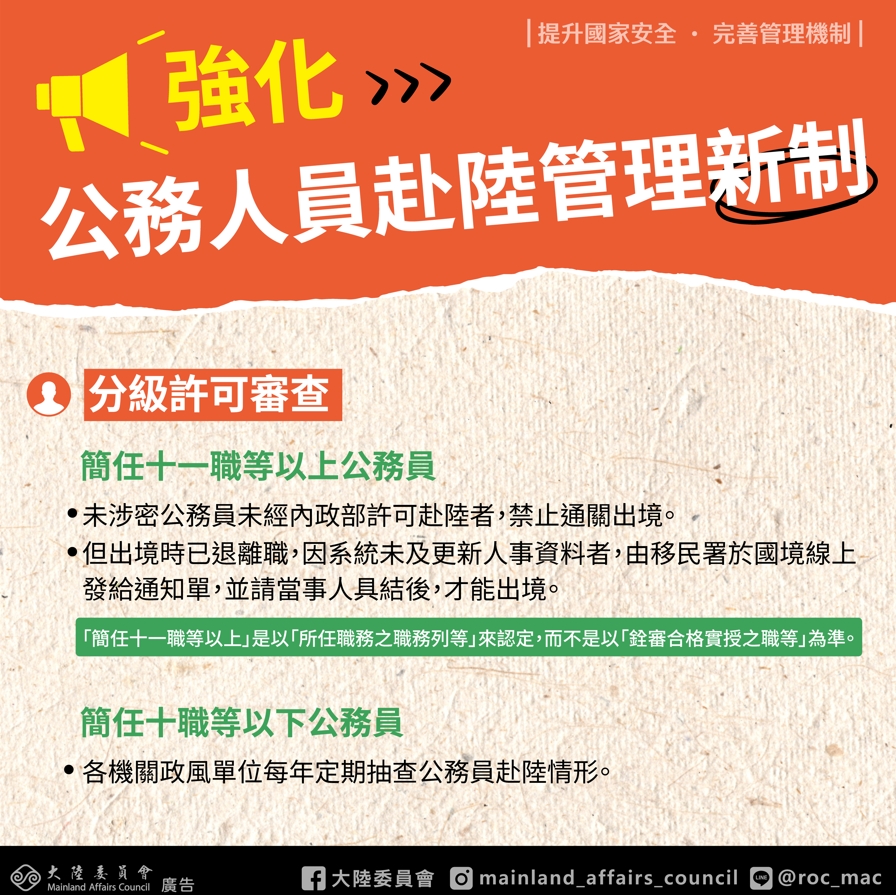 函轉行政院「行政院與所屬中央及地方各機 關(構)學校公務人員違法(規)赴陸建議懲處原則」及大 陸委員會之「強化公務員赴陸港澳管理機制」精進措施及宣導圖卡。